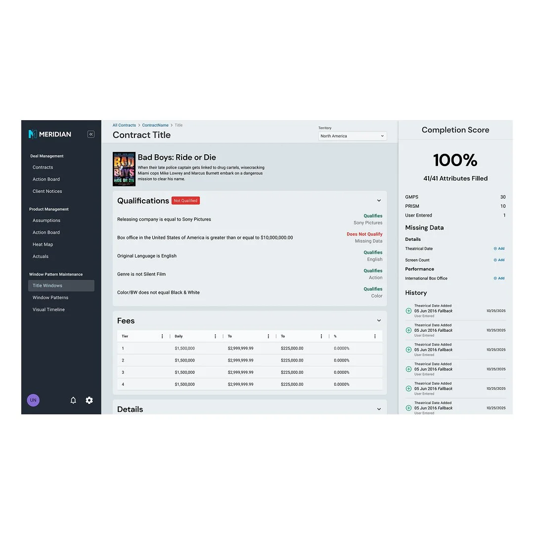 As a Product Designer at Sony Pictures Entertainment, I worked within the Distribution & Networks division on Meridian, an enterprise platform focused on long-term film deal strategy and rights management. The goal was to streamline how internal teams analyze, manage, and strategize complex film title agreements, supporting high-value licensing decisions across global markets. The challenge lay in designing intuitive tools for highly intricate workflows, balancing legal, financial, and strategic planning needs into a single cohesive product experience.